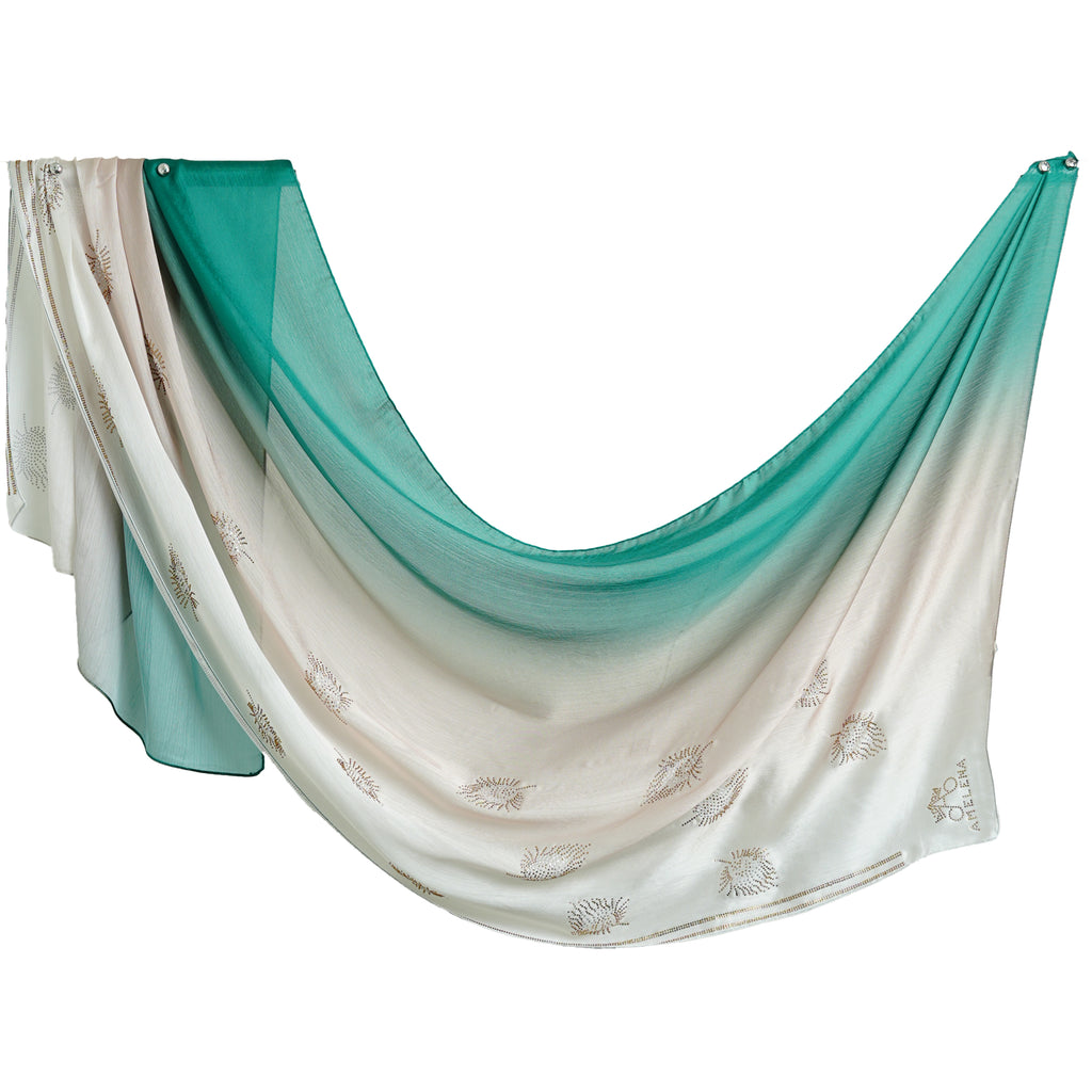Created from a luxurious silk‑chiffon blend softened with fine cotton, this AMELENA scarf offers an airy, elegant drape. Its ombré hues flow seamlessly from shade to shade, creating a soft gradient that elevates any look. Each piece is exclusively embellished with AMELENA’s signature crystal designs, adding a refined shimmer that feels both modern and timeless.