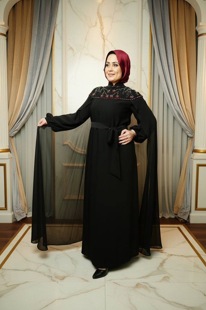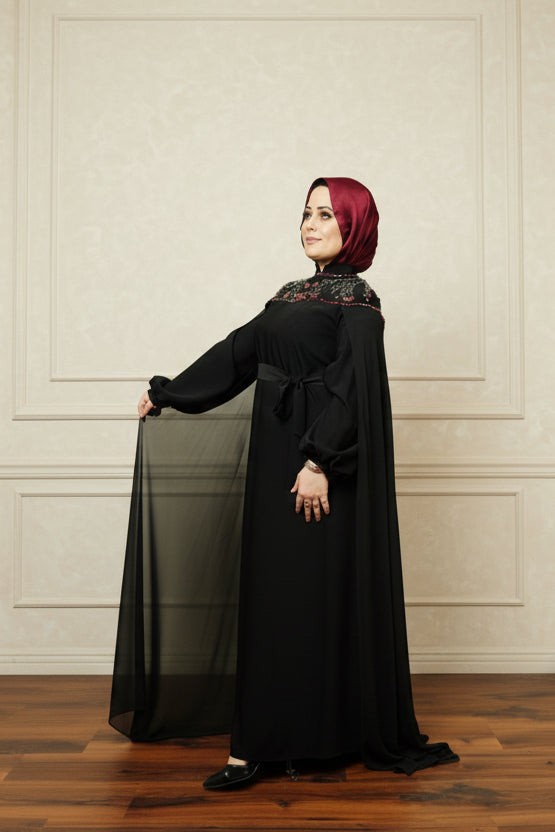 The highlight of this design is the attached chiffon cape, gracefully draped over the shoulder for a couture‑inspired finish. It adds fluidity, dimension, and a touch of ethereal charm—perfect for evening events, special occasions, or elevated everyday wear.